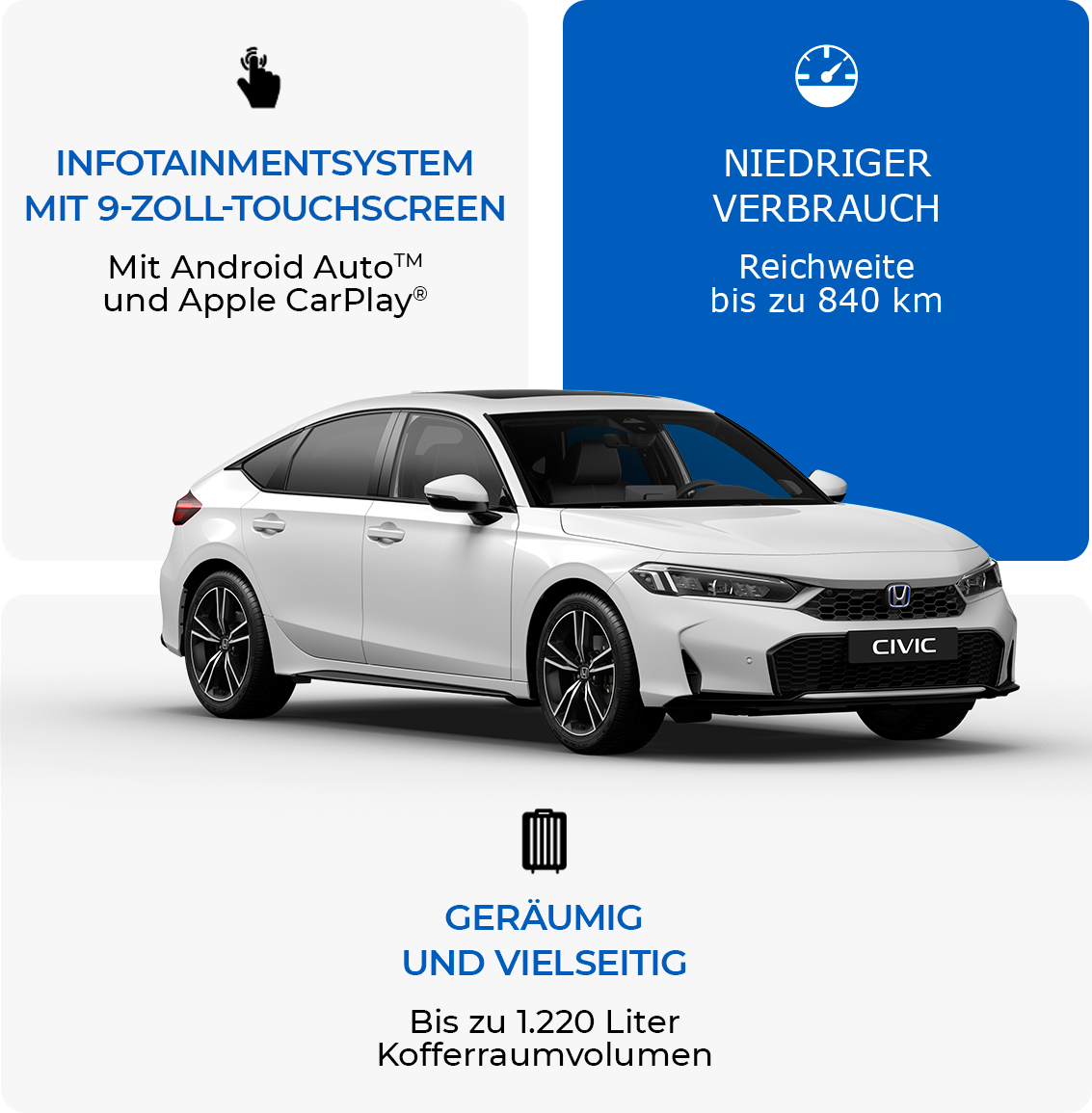 Angetrieben von Hondas fortschrittlicher e:HEV Vollhybridtechnologie, die echtes elektrisches Fahren im Alltag ermöglicht, überzeugt der Civic mit einem reaktionsschnellen, effizienten und umweltfreundlichen Antrieb – und bietet dabei Fahrspaß pur.